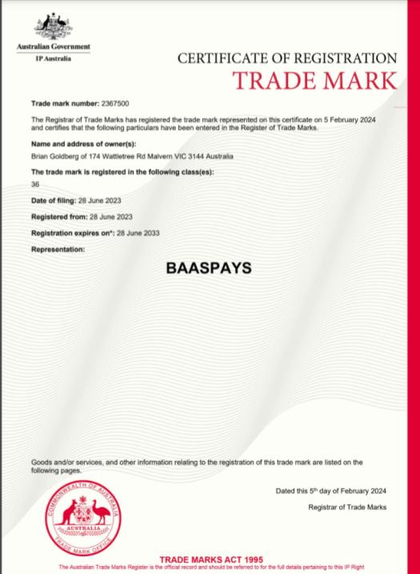 BAASPAYS Trademark can easily become a sub brand in your financial services company.